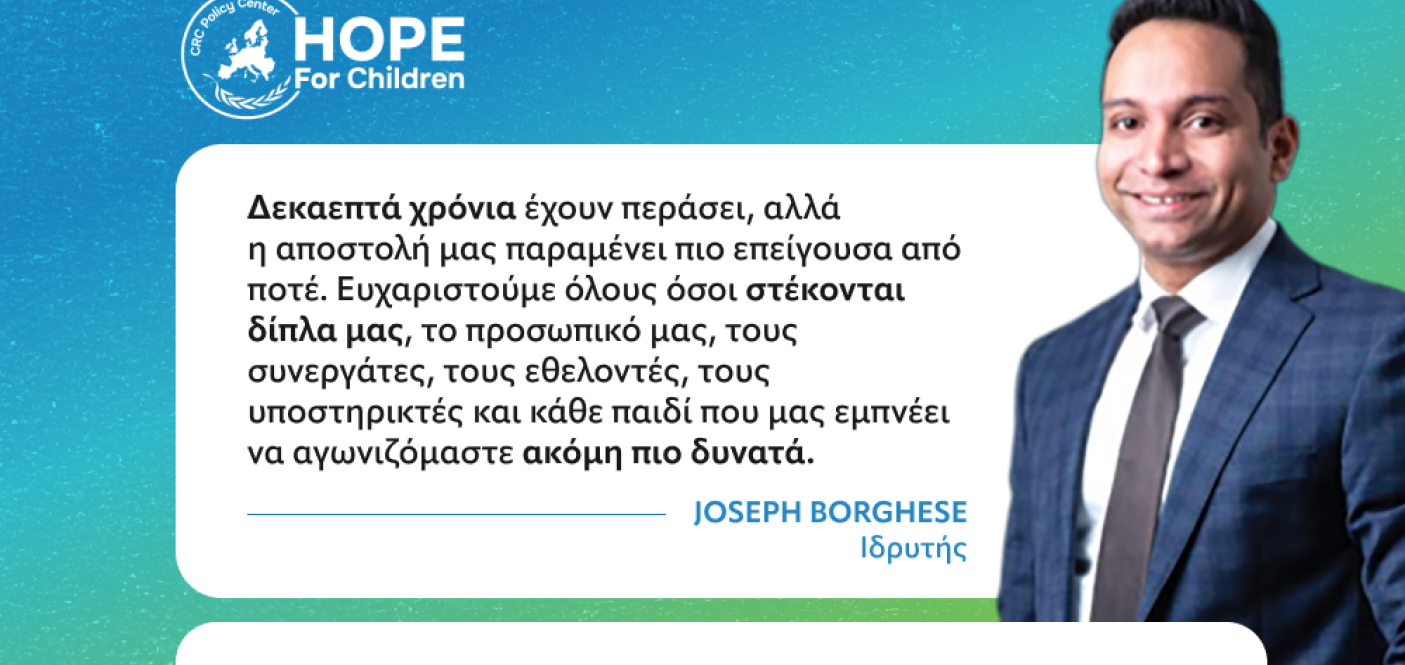 Δεκαεπτά χρόνια πριν, το “Hope For Children” CRC Policy Center δημιουργήθηκε από μια πολύ απλή αλήθεια: κάθε παιδί αξίζει προστασία, αξιοπρέπεια και ευκαιρίες, ανεξάρτητα από τις συνθήκες του. Αυτός ο Οργανισμός ξεκίνησε ως μια υπόσχεση, μια προσωπική δέσμευση να διασφαλιστεί ότι κανένα παιδί στην Κύπρο ή οπουδήποτε στην Ευρώπη δεν θα είναι αόρατο ή ανυπεράσπιστο. Σήμερα, αυτή η υπόσχεση έχει μετατραπεί στην αποστολή μιας ομάδας επαγγελματιών και συνεργατών που εργάζονται καθημερινά για να υπερασπιστούν τα δικαιώματα των παιδιών.